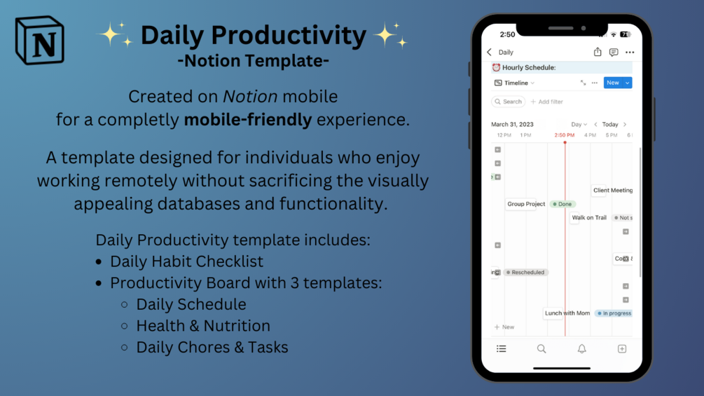 Introducing the Daily Productivity Notion template - the perfect mobile-friendly solution that combines aesthetics and functionality. Stay on track with your daily habits by checking them off on the visual progress bar. Plan out your day with the daily schedule board, which includes 3 different templates. The hourly view of your day ensures you don't miss a beat. Keep your health and nutrition on track by tracking your calories and workout plan on the health template. Stay on top of your daily tasks and chores with the organizational daily chores and tasks template. With this template, you won't miss a beat!