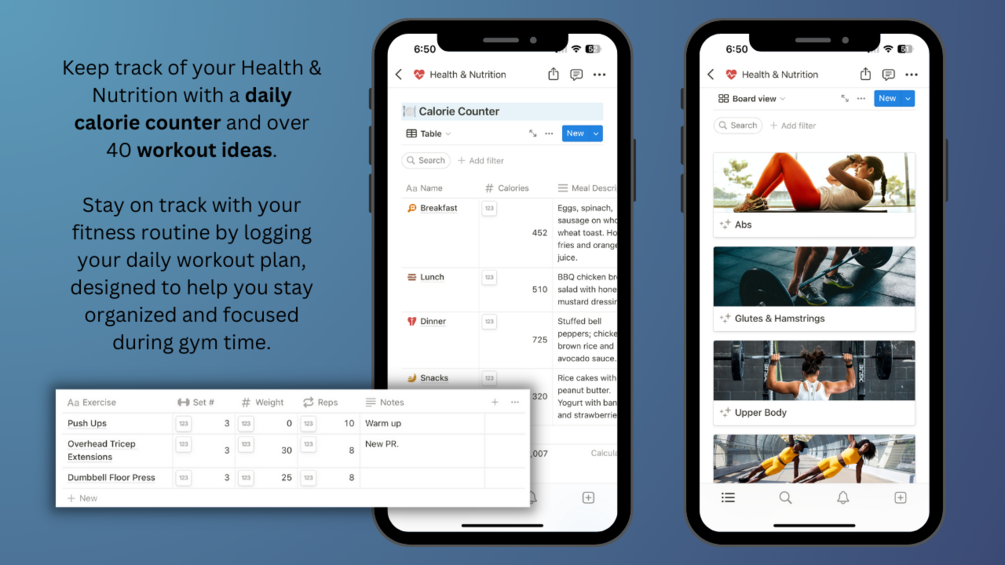 - Health & Nutrition: Progress check-in, calorie counter, workout idea board, and workout planner.