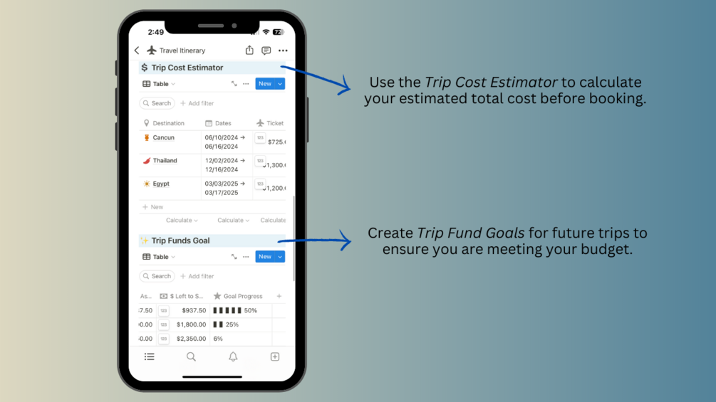 - Trip Fund Goals database to keep track of your savings set aside for each trip with a goal progress bar.